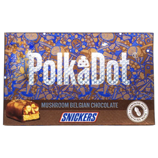 Schokoladenriegel mit Polkadot-Muster: the magic mushroom Belgian chocolate bars are chocolate bars that contain an infusion of 4 g of the magic blend. With airy rice and light crispies, this crunchy bar is coated in rich and creamy Belgian milk chocolate. It is equivalent to 4 g of psychedelic mushrooms; you can self-dose by adhering to the dosage instructions provided on the package’s side. Polkadot Snickers 4g Chocolate Bars Available for Purchase