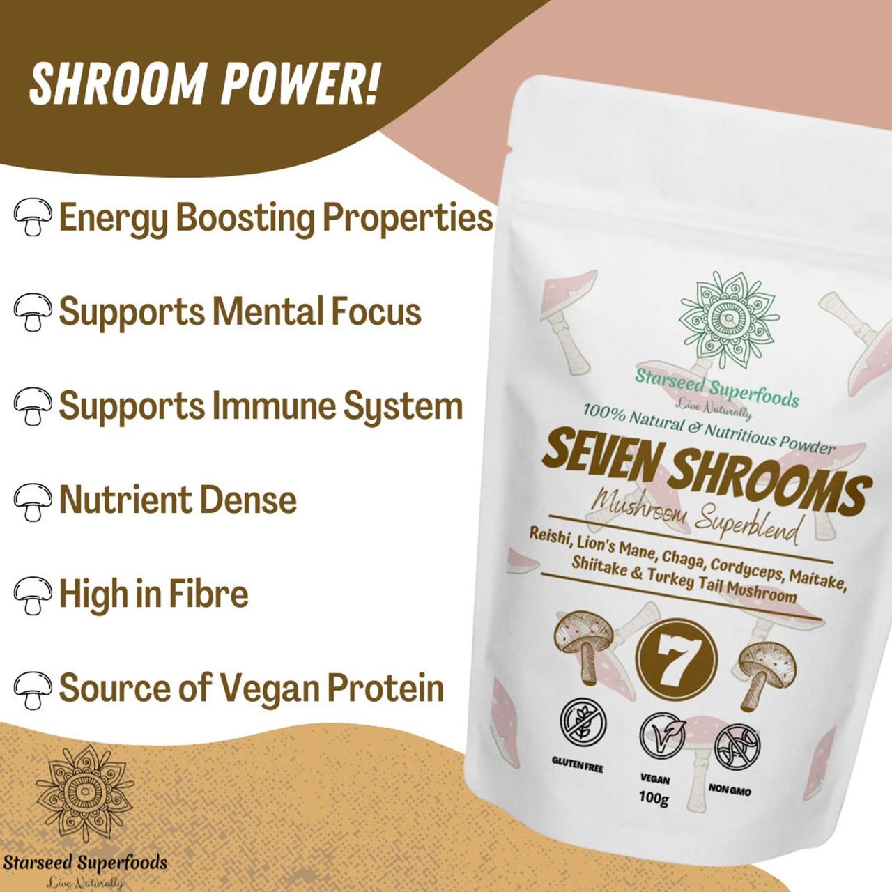 An earthy blend of seven medicinal mushrooms, each with it’s own benefits. This blend is both high in fibre and a good source of vegan protein.